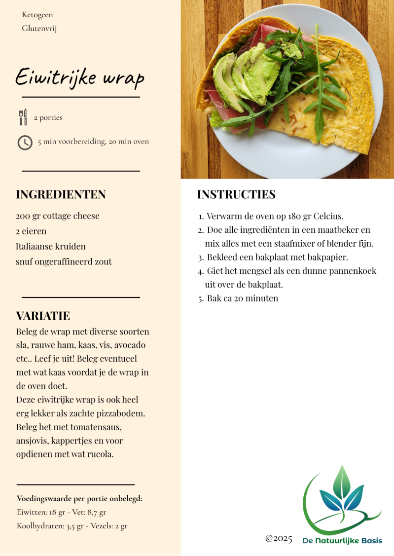 Soms kan het best lastig zijn om voldoende eiwitten bij de lunch binnen te krijgen. Deze wrap is snel voor te bereiden, wordt gebakken in de oven en kun je ook prima koud eten. Maak dus gelijk even een dubbele portie! Varieer met beleg, maar ook met bijvoorbeeld kruiden door de wrap. Denk aan pesto, Italiaanse kruiden of een andere mix, experimenteer!